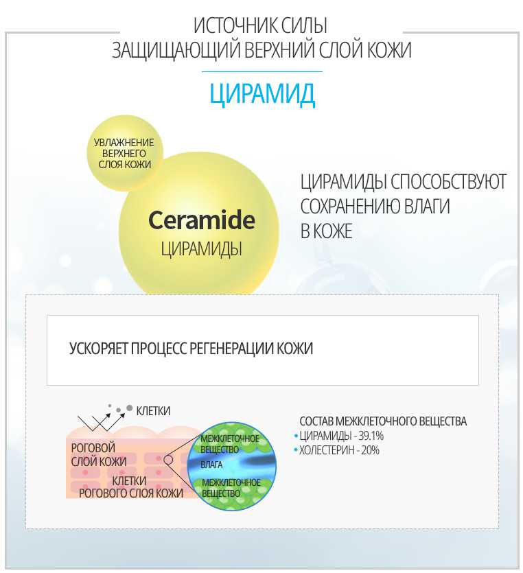 • Цирамид (Ceramide) - источник силы для защиты верхнего слоя кожи. Цирамиды способствуют сохранению влаги в слое кожи под верхним роговым слоем.